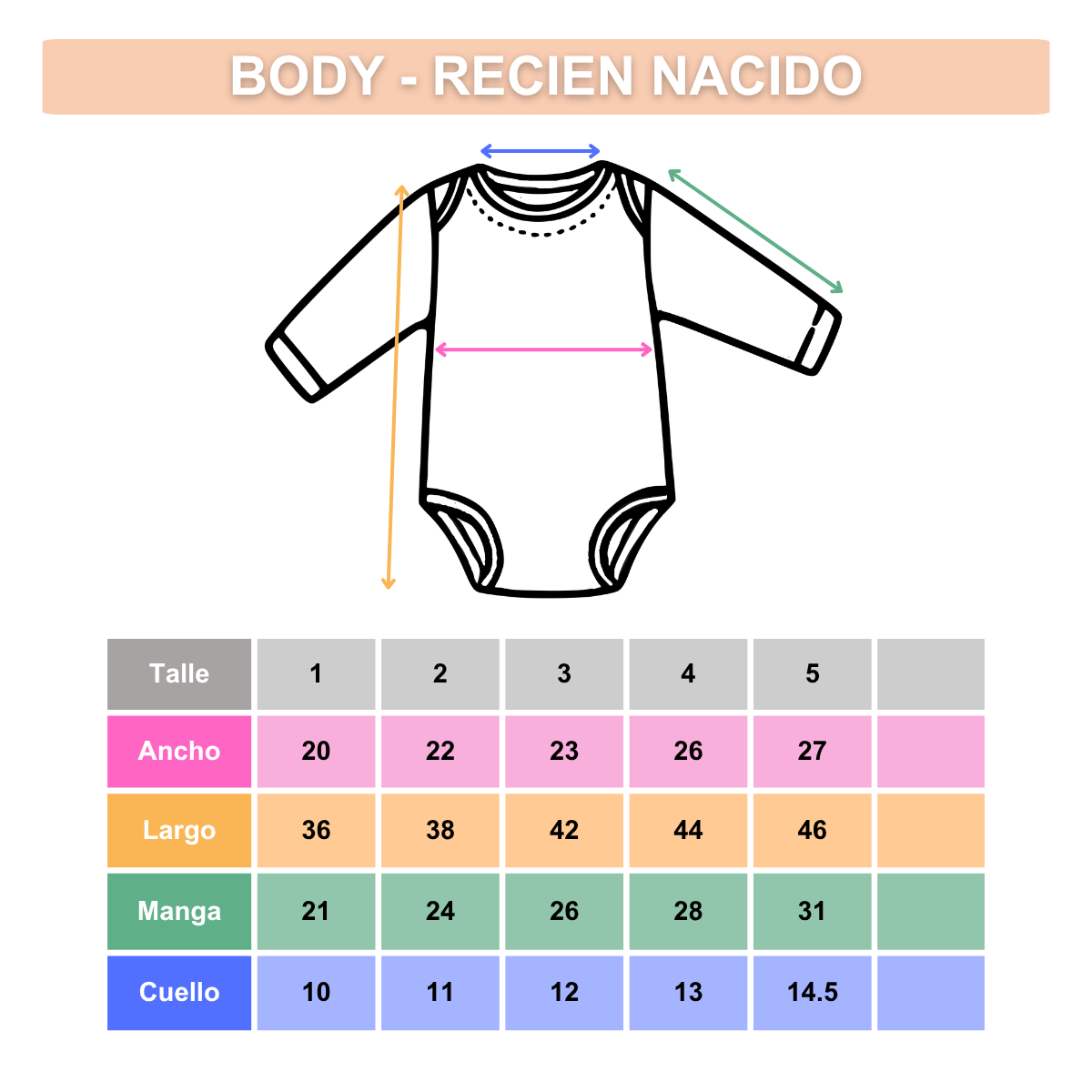 Talle 1: Largo 36cm. Ancho 20cm. Largo de manga 22cm